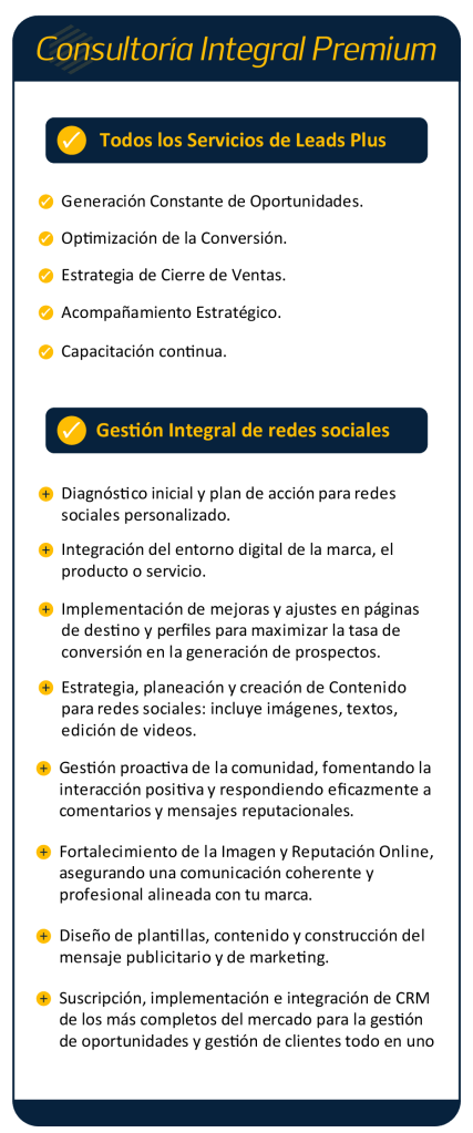 En este proceso, integramos comunicaciones, marketing, publicidad, medios, redes sociales y ventas. Estamos aquí para disminuir tu curva de aprendizaje y ayudarte a generar prospectos de clientes, así como a acompañarte en el proceso de cierre de ventas para mantener y escalar tu negocio.